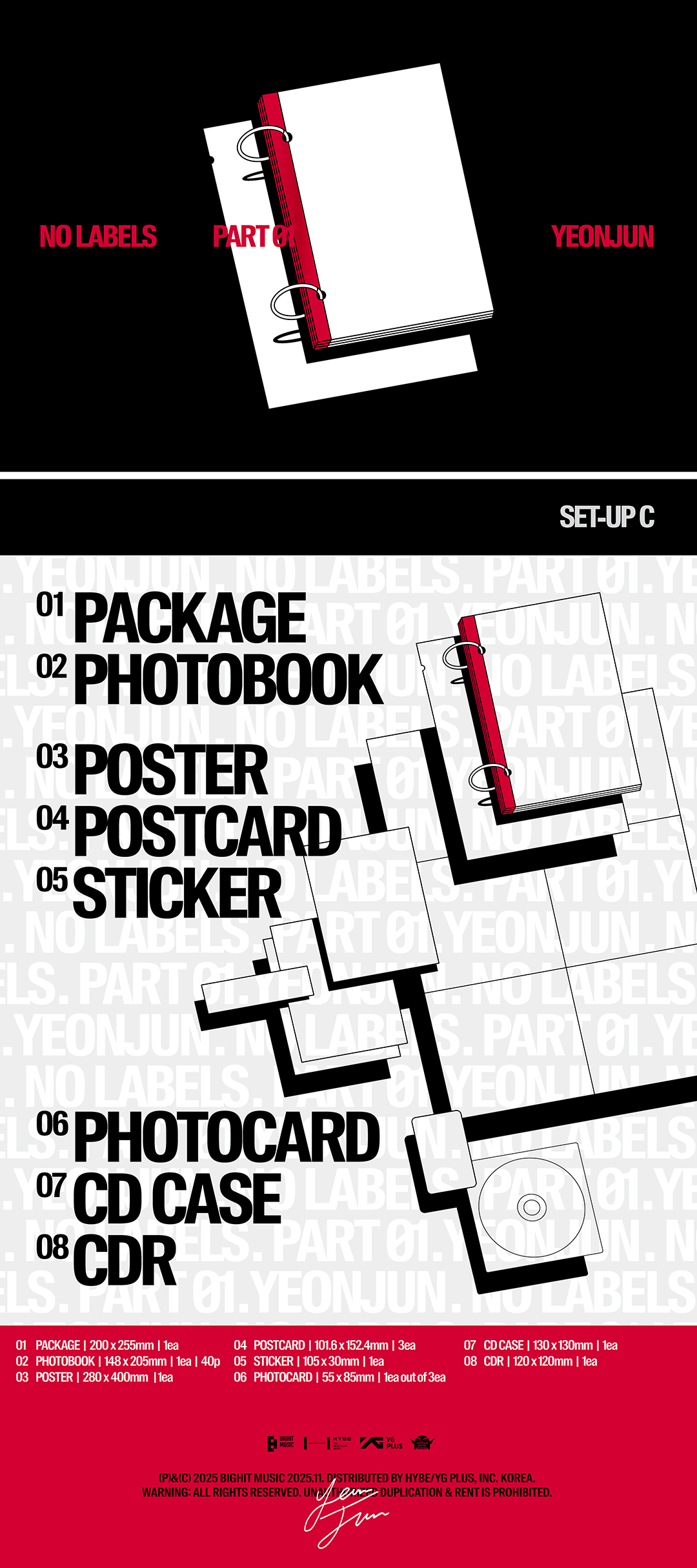- SET-UP A: Outbox, Jewel Case, Photobook (40pg), Postcard, Lyric Book.