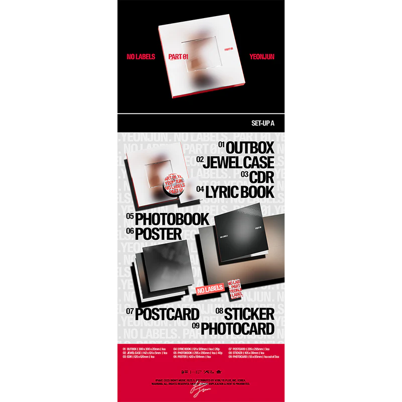 - SET-UP A: Outbox, Jewel Case, Photobook (40pg), Postcard, Lyric Book.